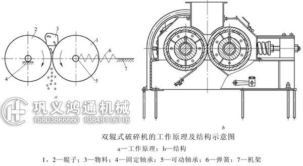 双辊式破碎机由两个圆柱形辊筒作为主要的工作机构,工作时,电动机通过三角皮带和一对长齿轮,带动量个破碎辊作相同的旋转运动,由于物料和棍子之间的摩擦作用,将给入辊子上方的物理卷入两辊所形成的破碎腔内而被压碎。
