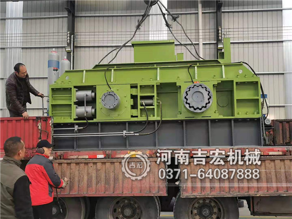 由两个锰铬合金辊皮、整机罩子、机架、电机、减速机、万向节系统、液压系统、自动黄油加装器、一体振动给料机等部件组成。