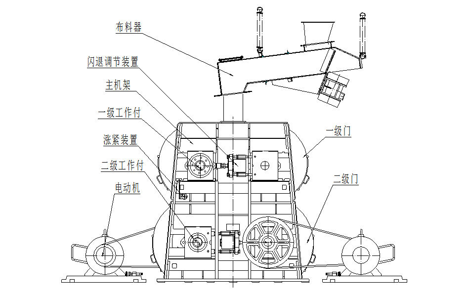 4PG型破碎机主要由主机架、一级和二级工作副、闪退调节装置、皮带轮、电气控制系统、电动机、布料器等组成。4PG型破碎机的主要结构如下图: